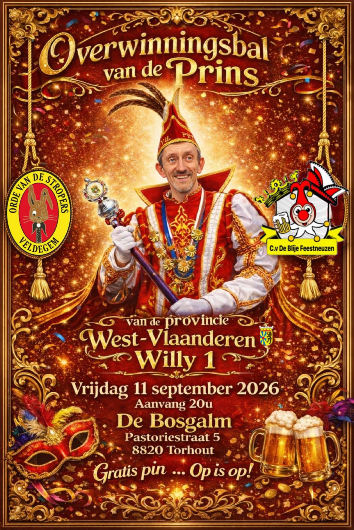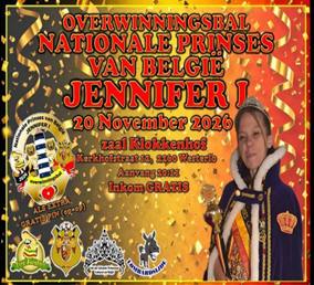 Zaterdag 25 april 2026 District prins Benny I & Stadsprinses Inge I gezamenlijk OverwinningsbalParochiecentrum Boudewijnstraat 10a 2280 Grobbendonk Aanvangstijd: 20:00 uur