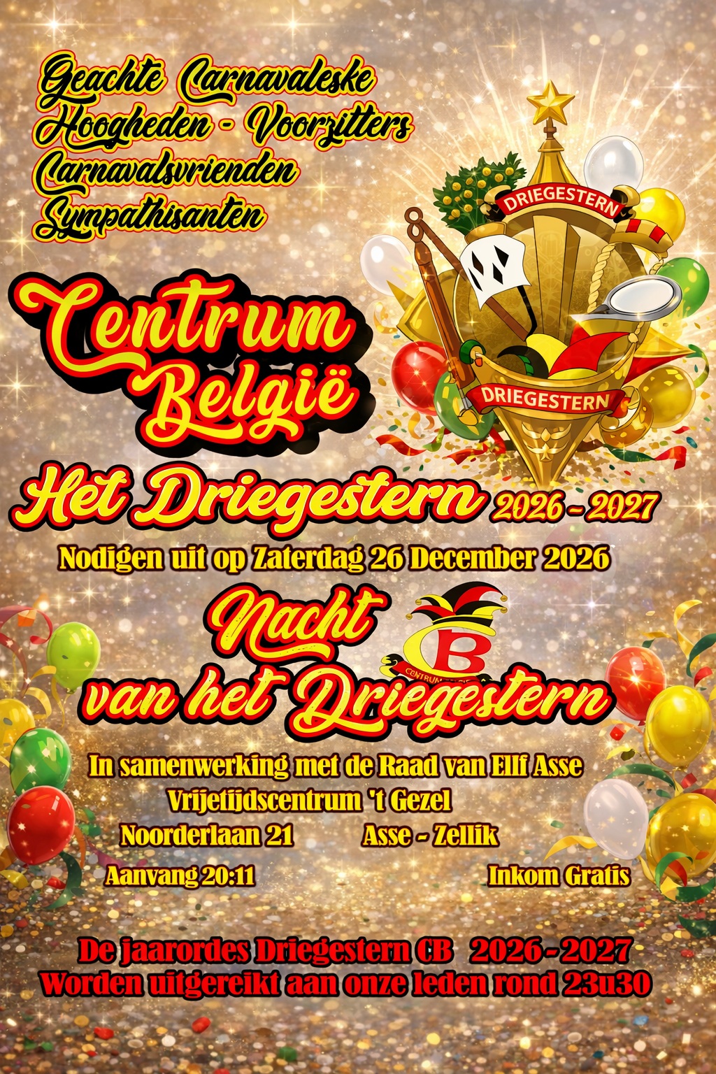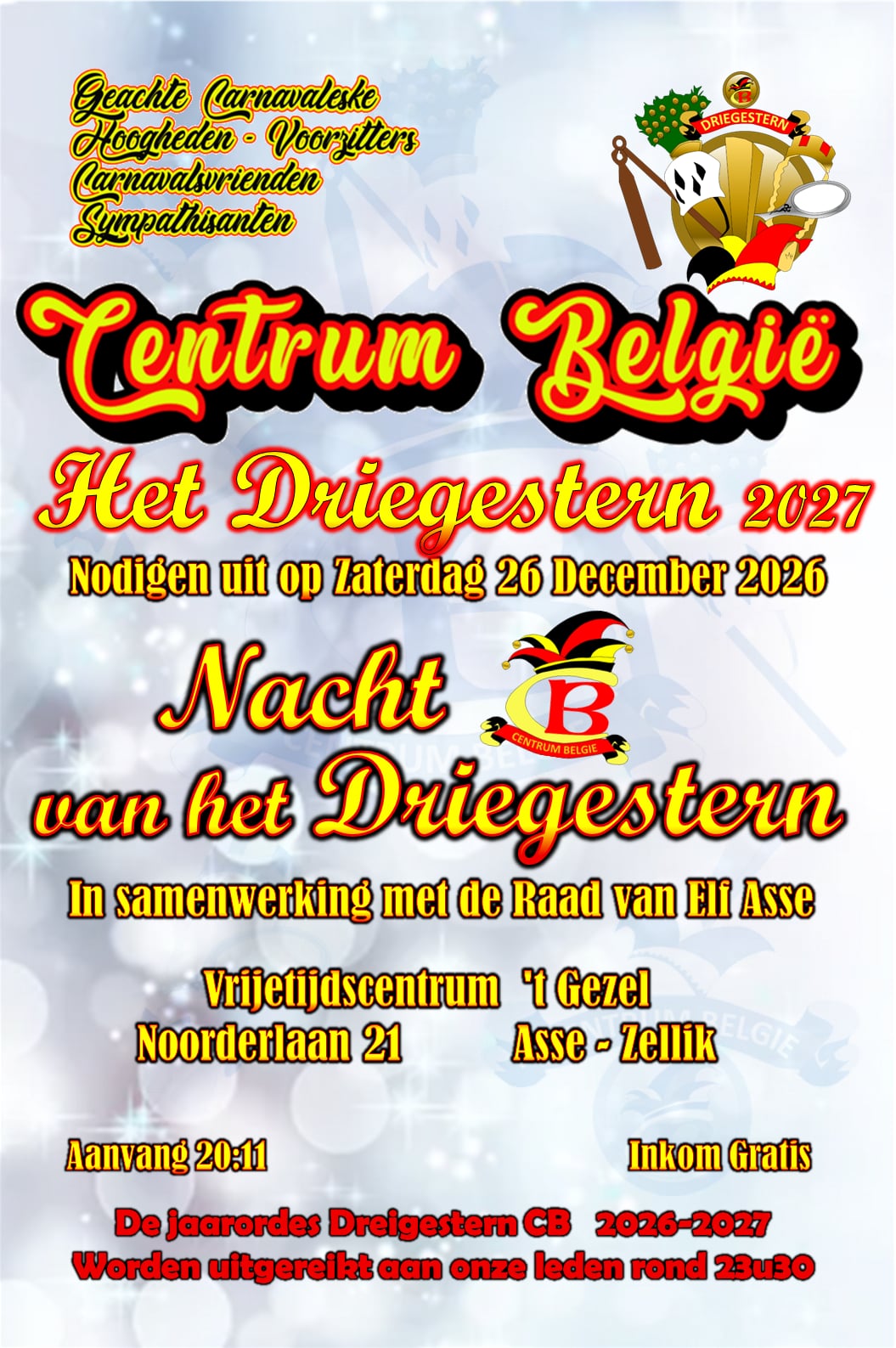 Zaterdag 26 december 2026 CENTRUM BELGIE Nacht van het Driegestern Feestzaal "'t Gezel" Noorderlaan, 21 te Asse-Zellik. Aanvangstijd: 19:30 uur