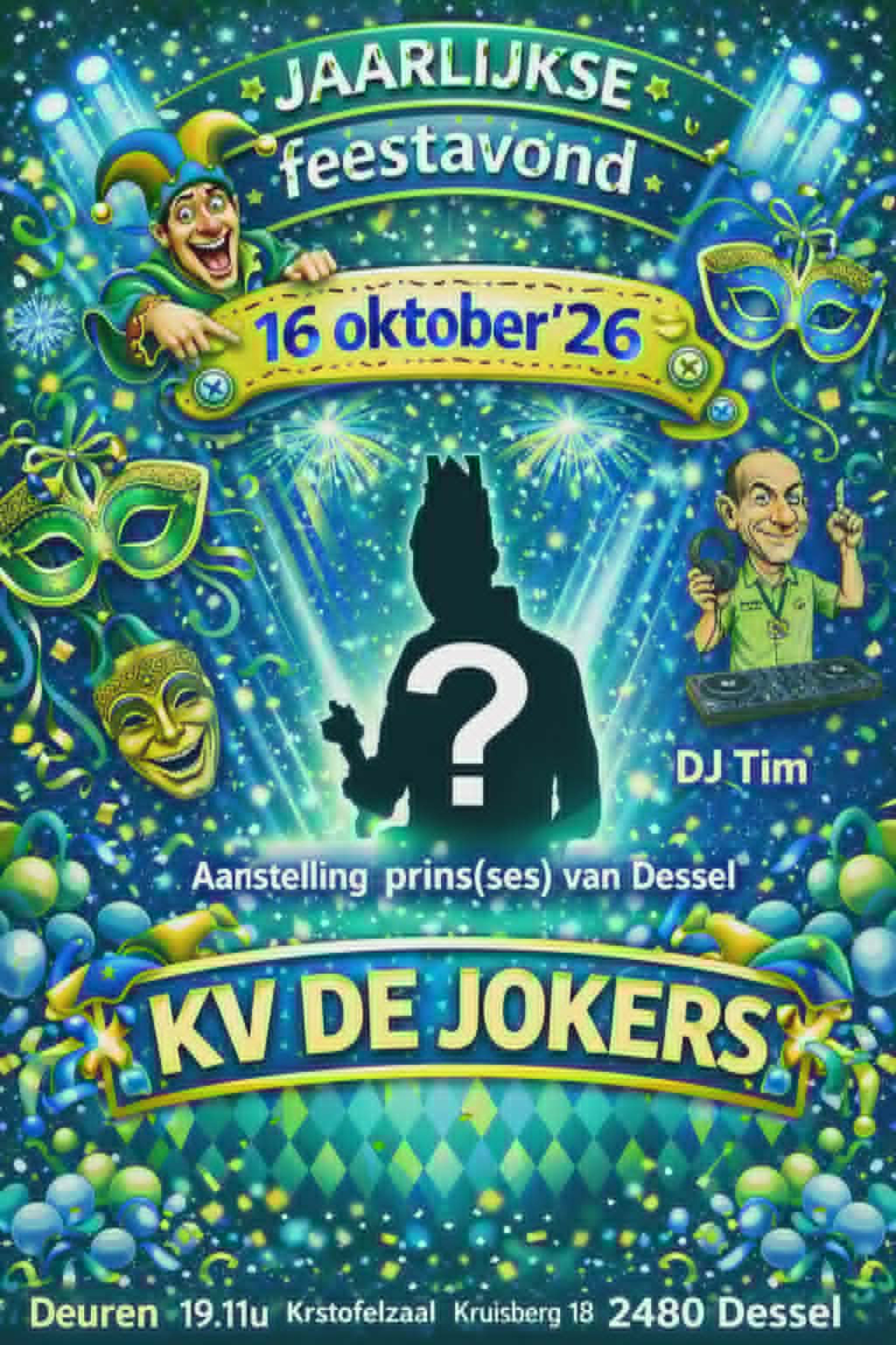 Donderdag 12 februari 2026 DE JOKERS -Sleuteloverdracht Gemeentehuis Dessel - Hannekesstraat 1 - 2480 2480 - Dessel Aanvangstijd: 14:11 uur DE JOKERS - Prinselijke rondgang café's rond de markt & eten met de Prins Mini-Museum KV De Jokers + Cafés Rond De Markt Molsebaan 11 - 2480 2480 - Dessel Aanvangstijd: 15:11 uur